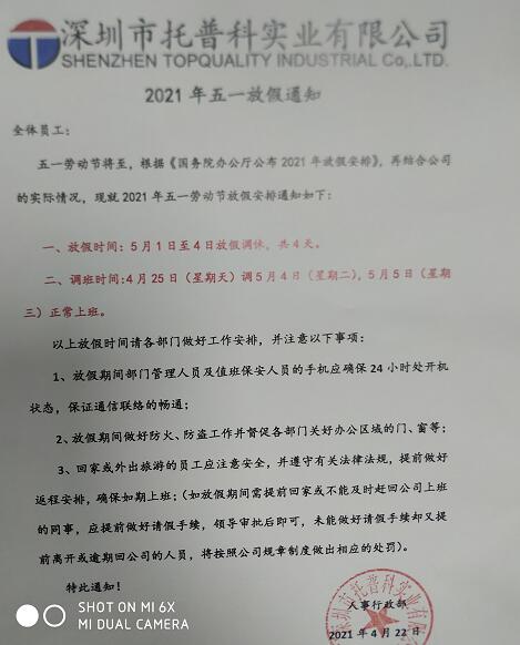 2021年五一勞動節(jié),深圳托普科實業(yè)放假通知