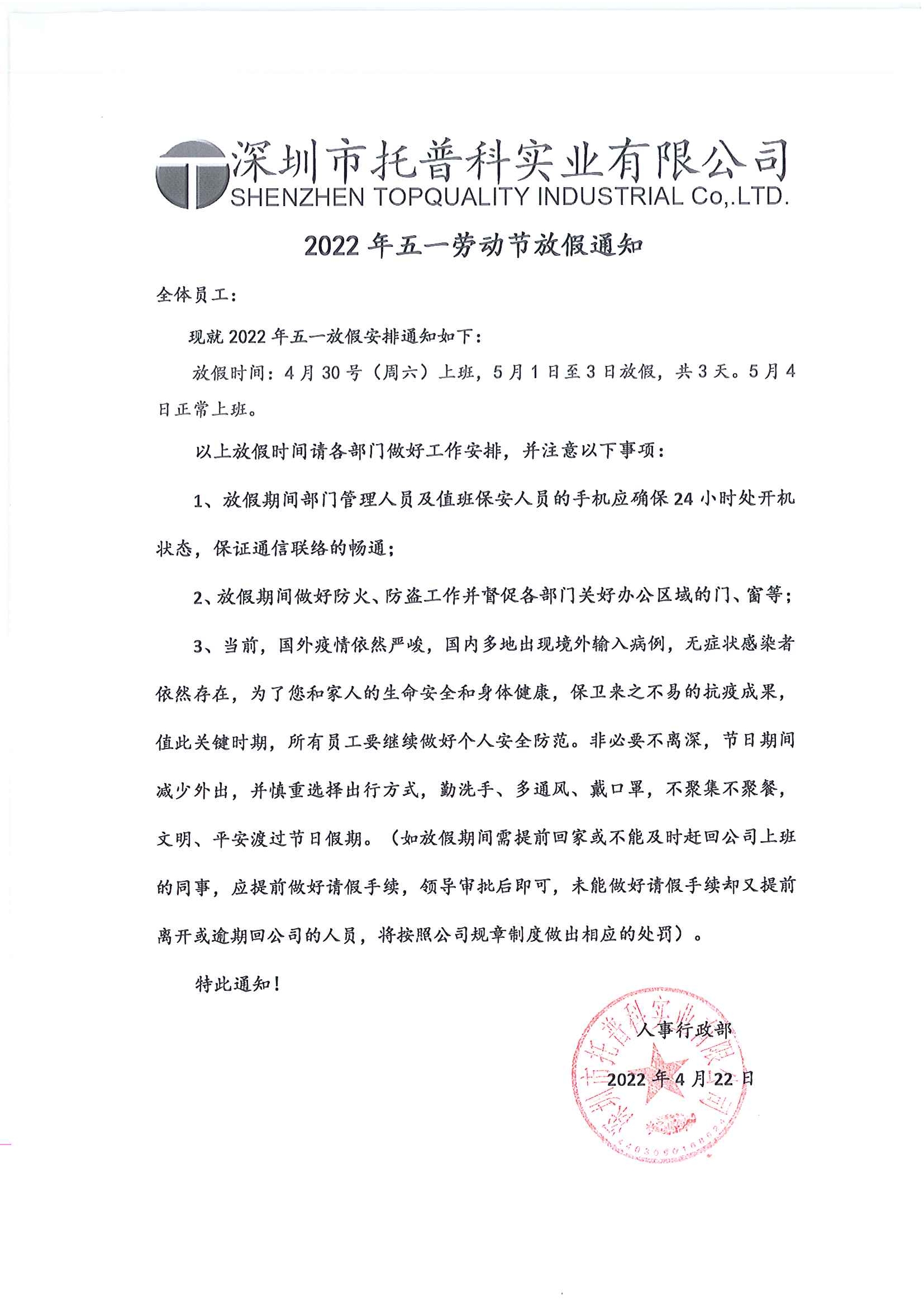 深圳托普科2022年五一勞動(dòng)節(jié)放假公告